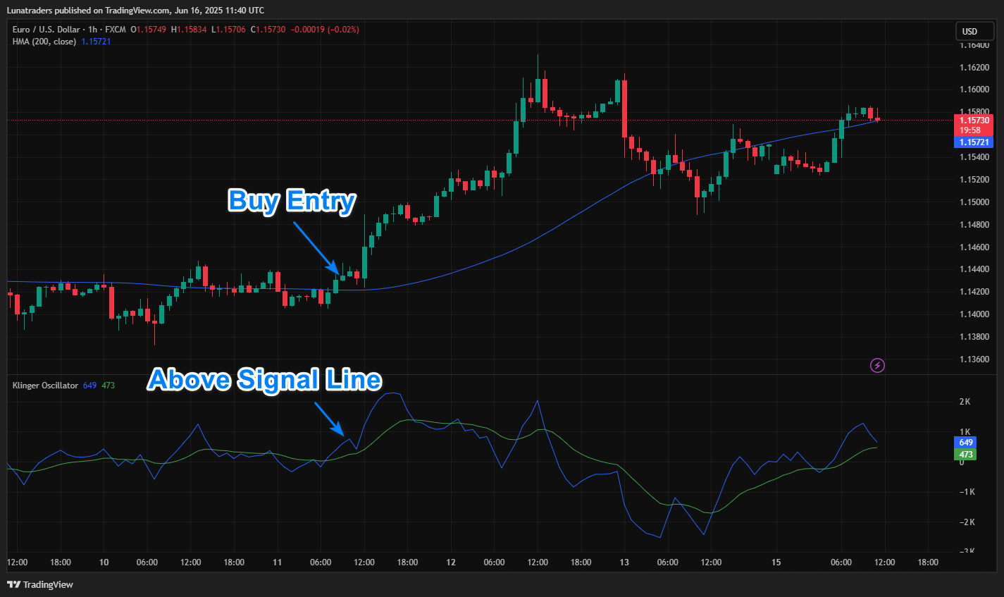 - Klinger Oscillator must cross above the Signal Line. Indicates bullish momentum supported by volume.