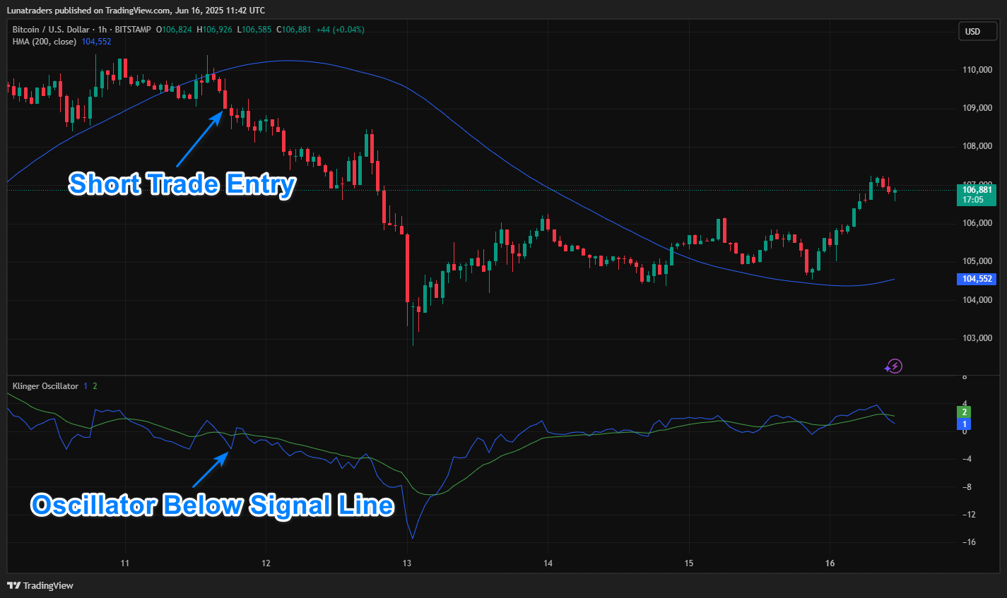 - Klinger Oscillator must cross below the Signal Line. Indicates bearish momentum.